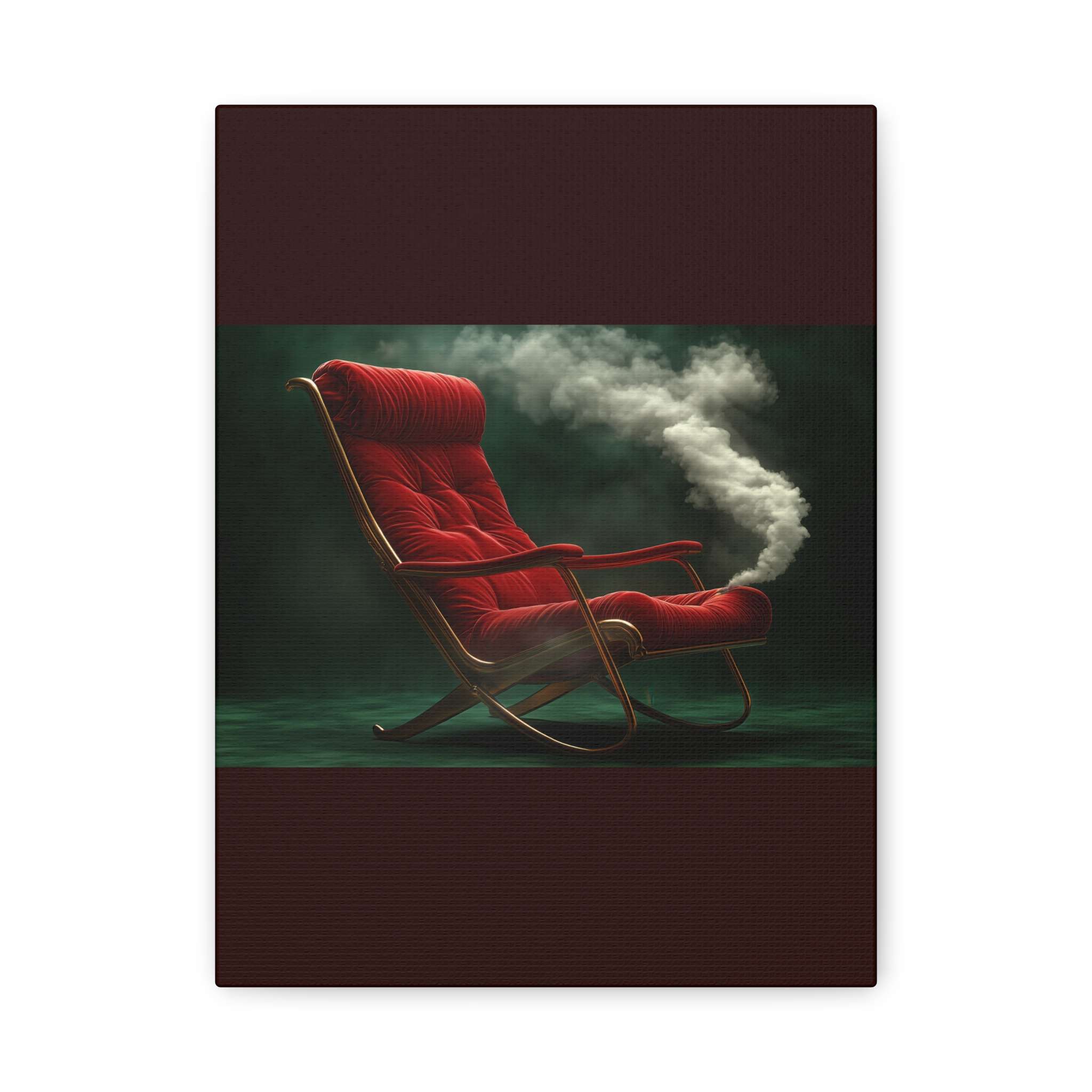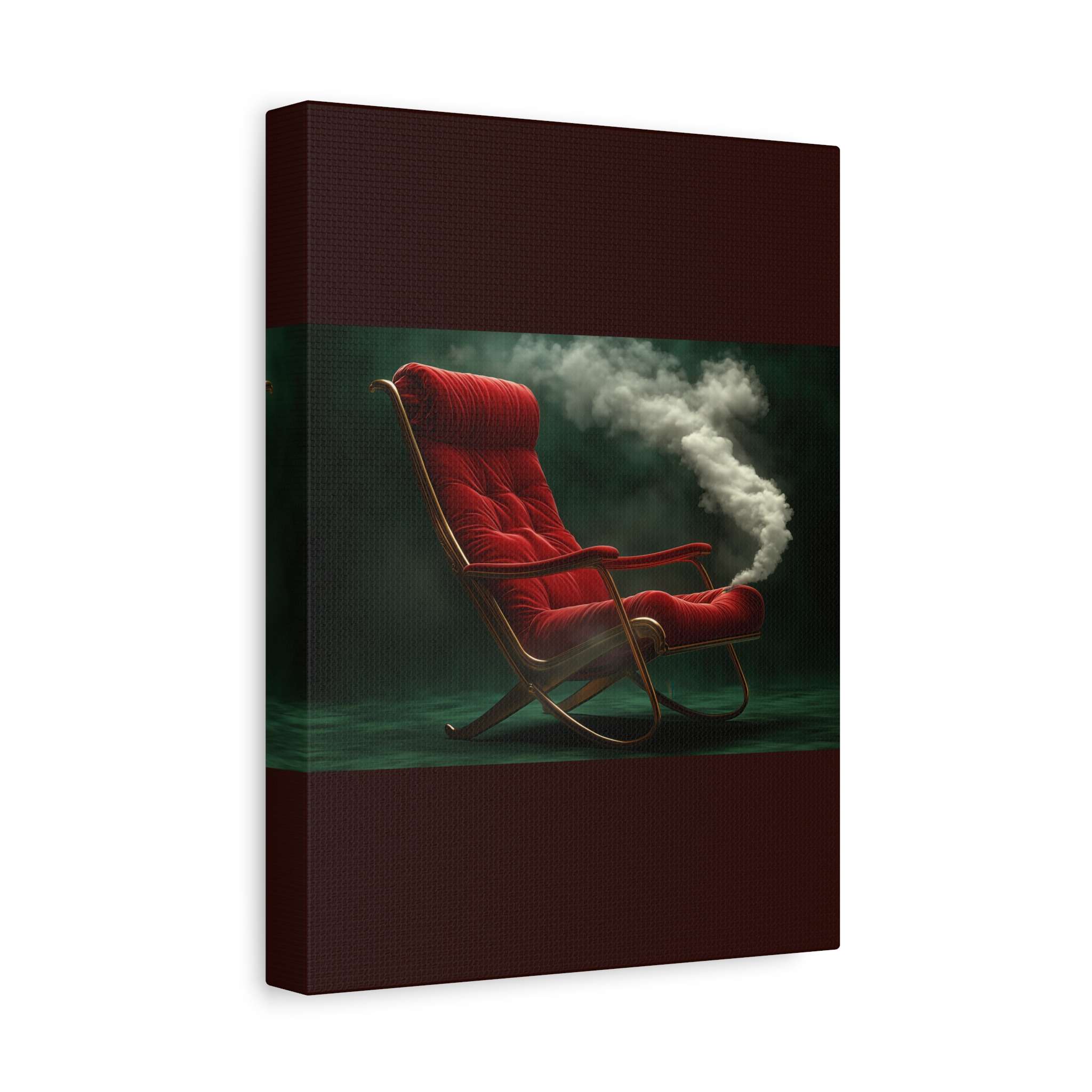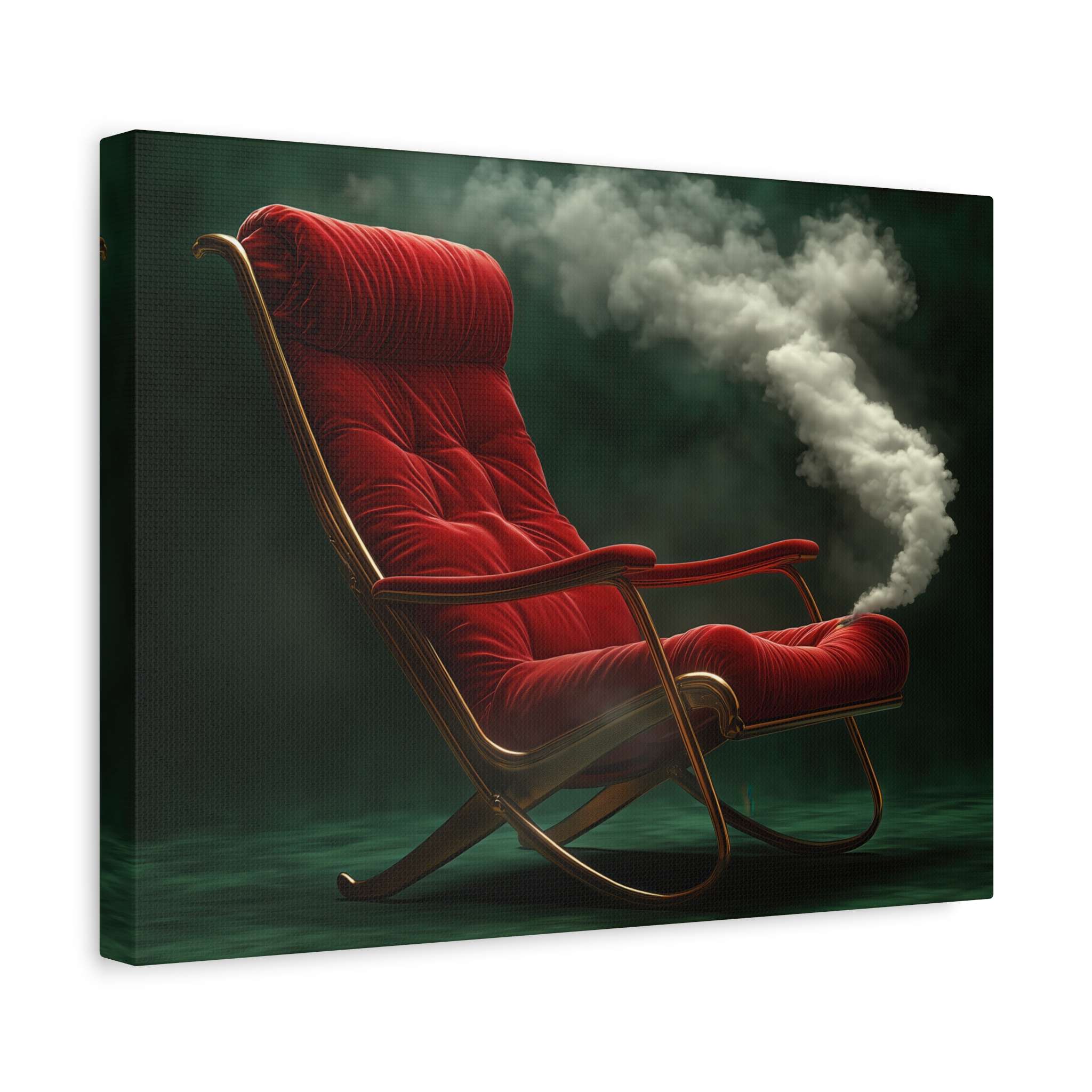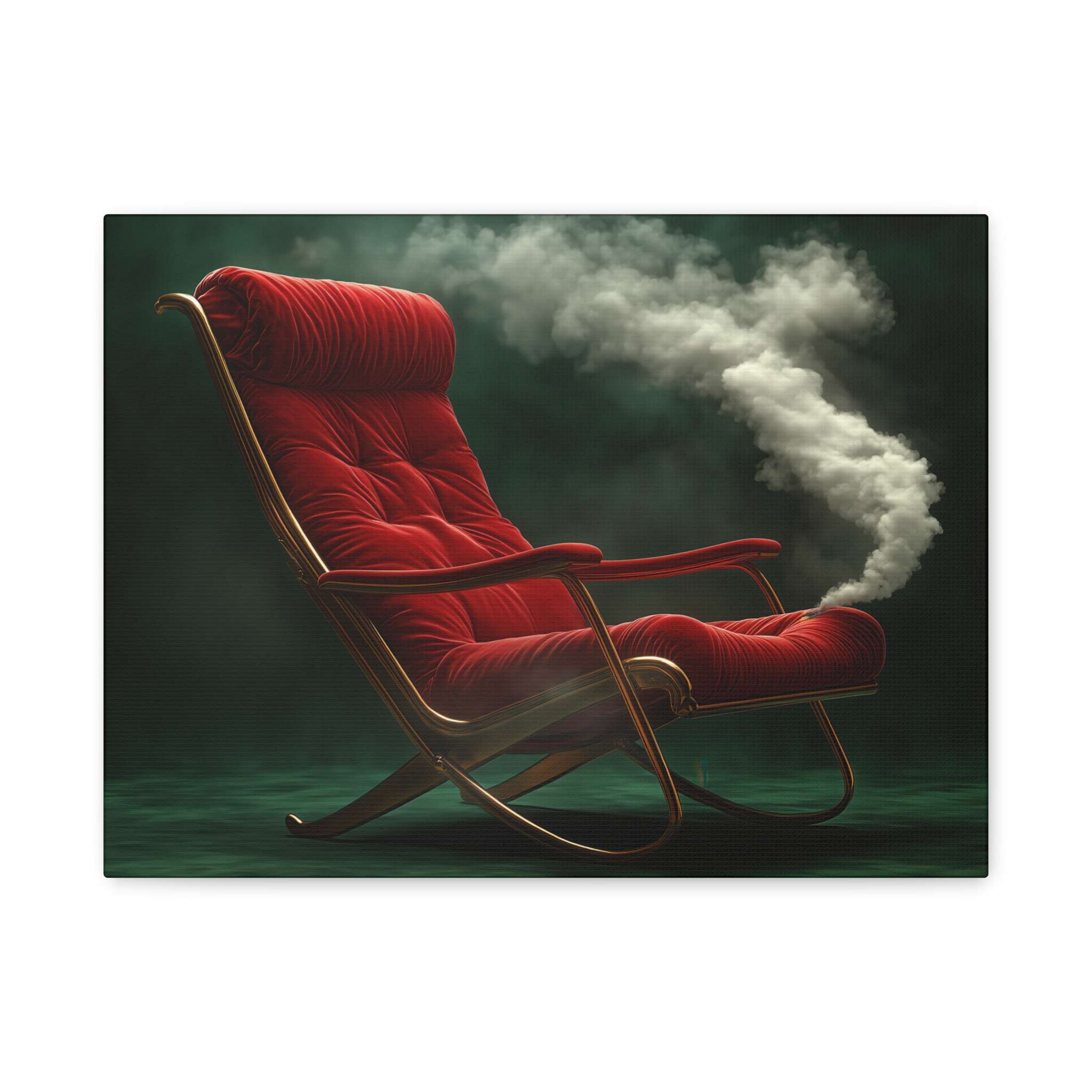 This canvas print features a luxurious red velvet armchair emitting a plume of white smoke against a dark green background, creating a surreal and mysterious ambiance. The wooden frame adds a vintage charm to the scene, making it perfect for art lovers and vintage enthusiasts. Ideal for adding a touch of elegance to any room, this canvas print is perfect for home decor, gifts for housewarmings, birthdays, or holidays.