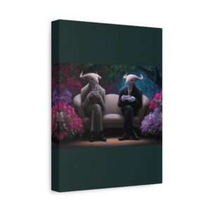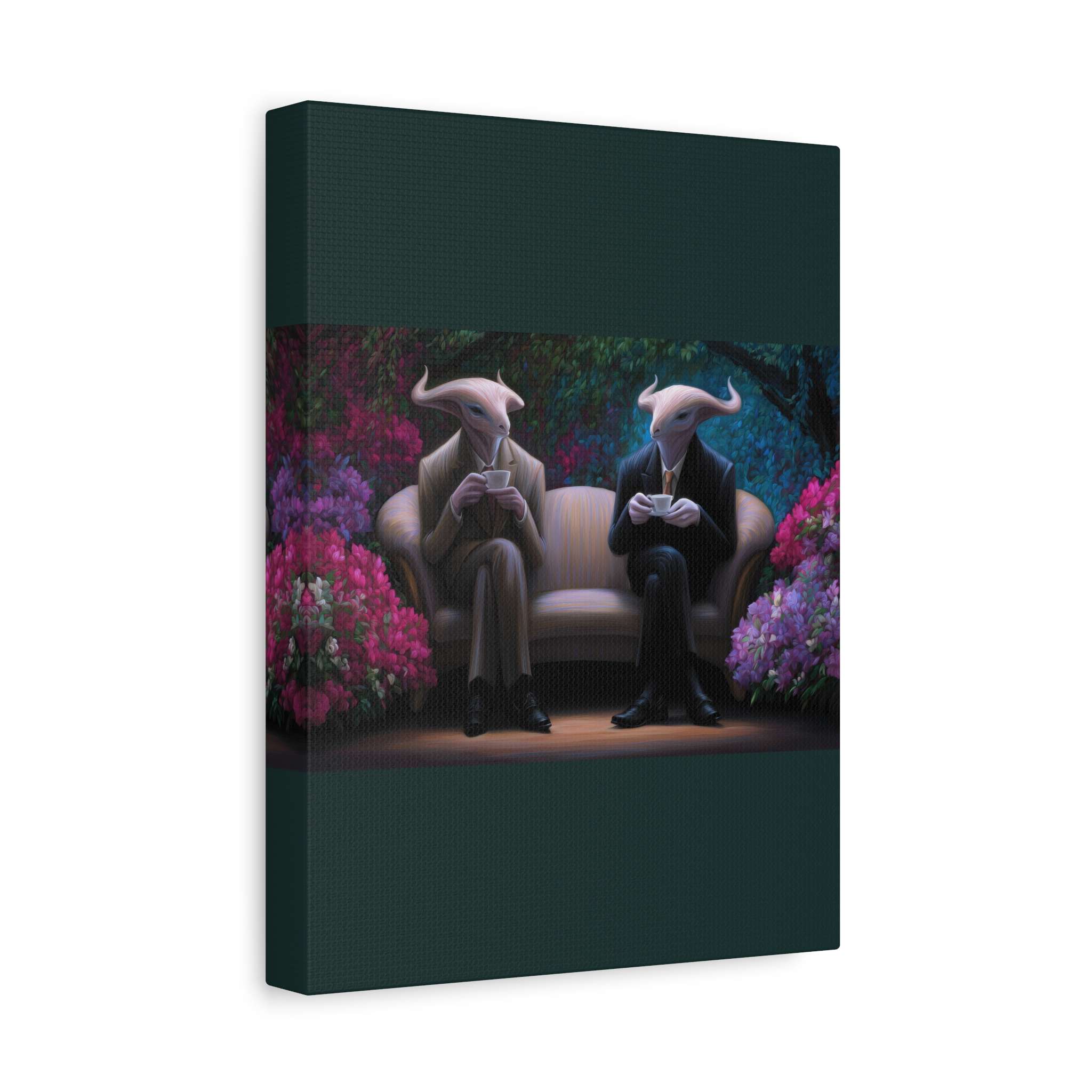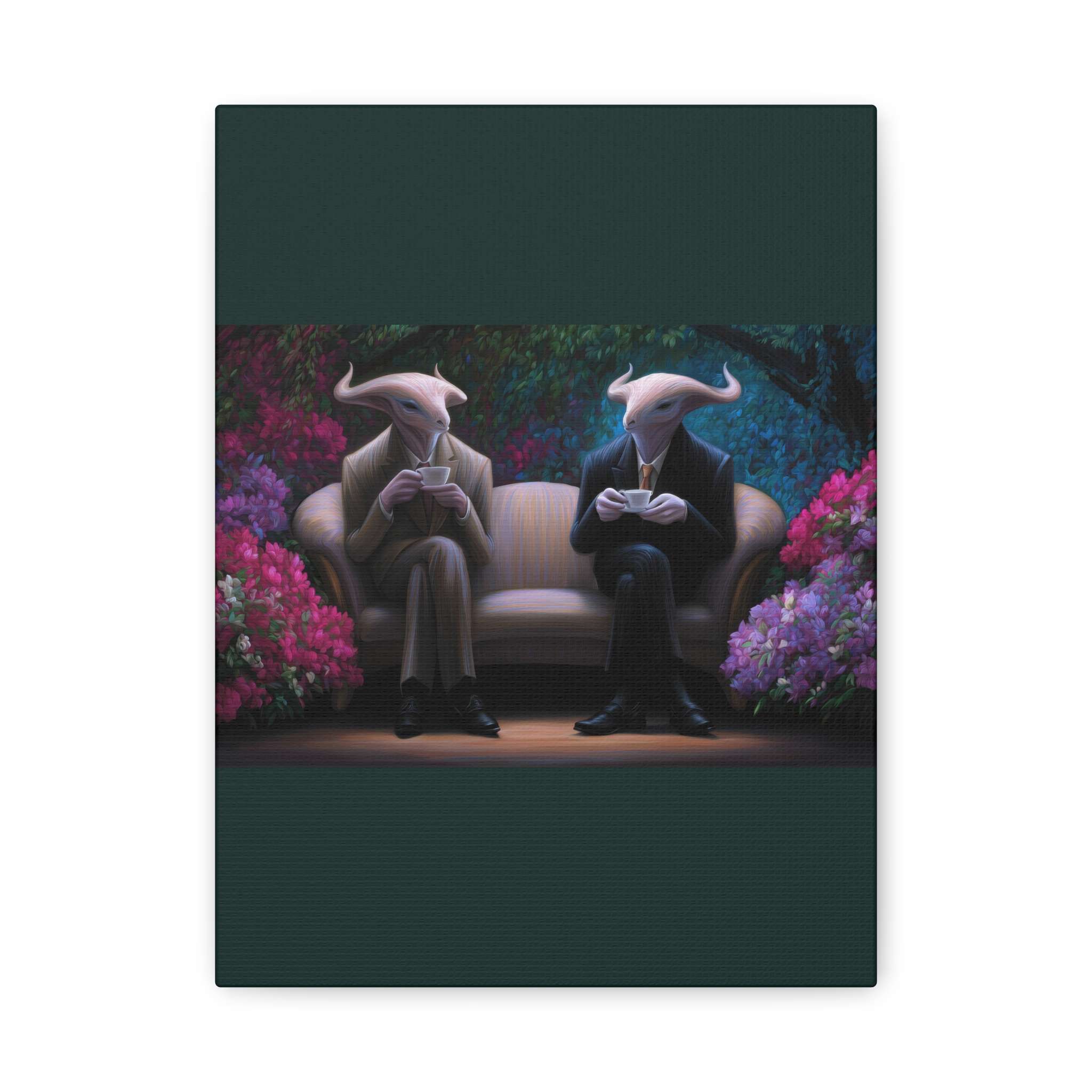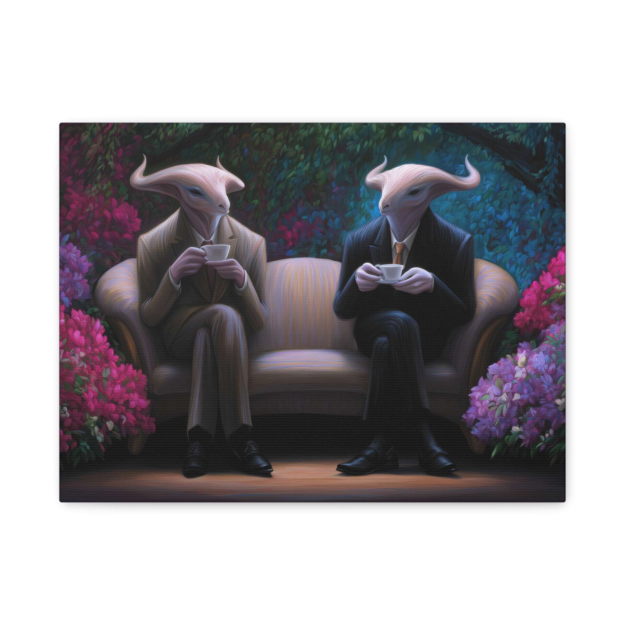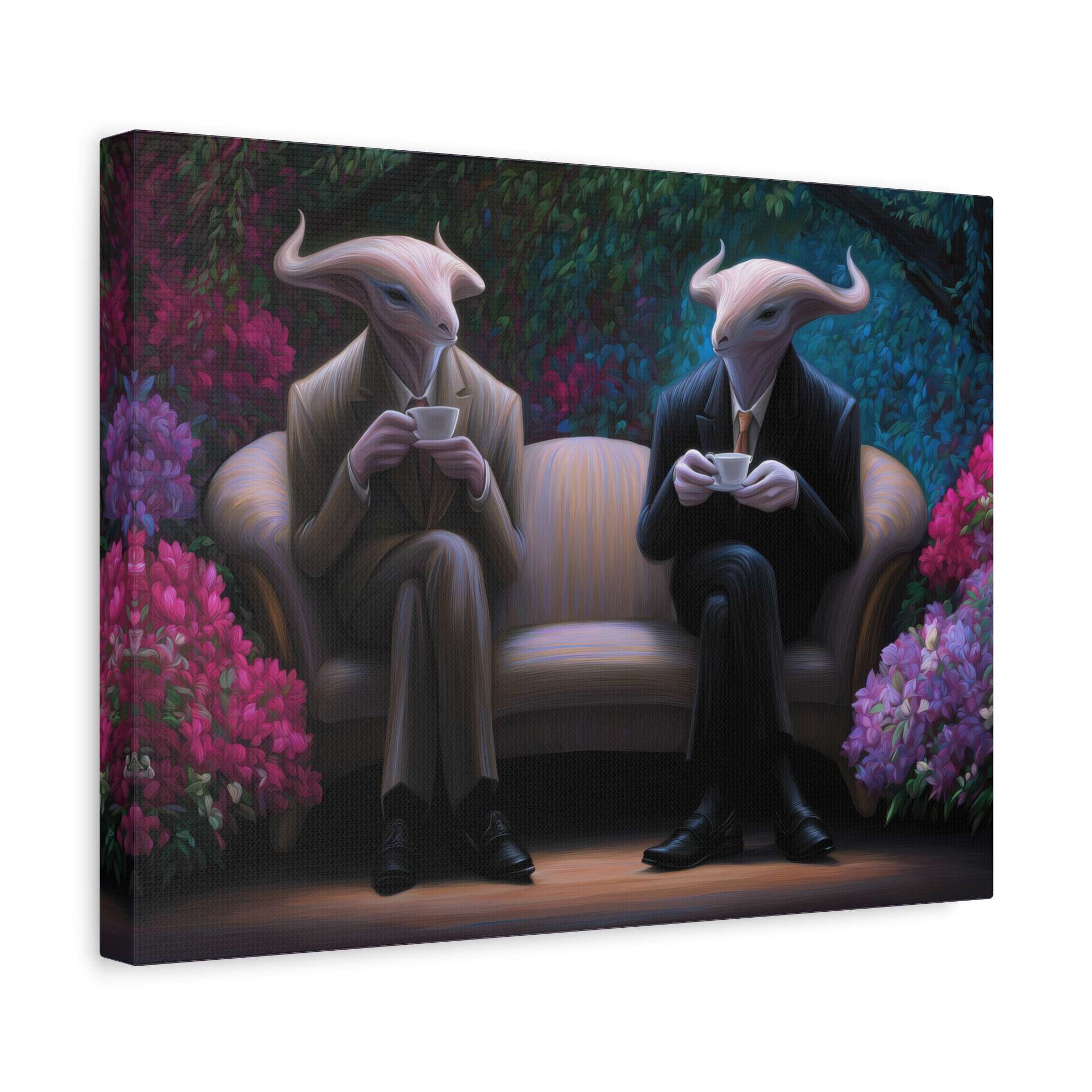 This canvas print features two horned creatures in suits sitting on a couch surrounded by vibrant flowering plants, creating a fantastical garden setting. The unique design gives off a whimsical and magical vibe, perfect for fantasy lovers and those who enjoy unique home decor. Ideal for adding a touch of whimsy to any room, this canvas print is great for individuals looking to add a pop of color and fantasy elements to their living space. Perfect for birthdays, housewarmings, and fantasy-themed events.