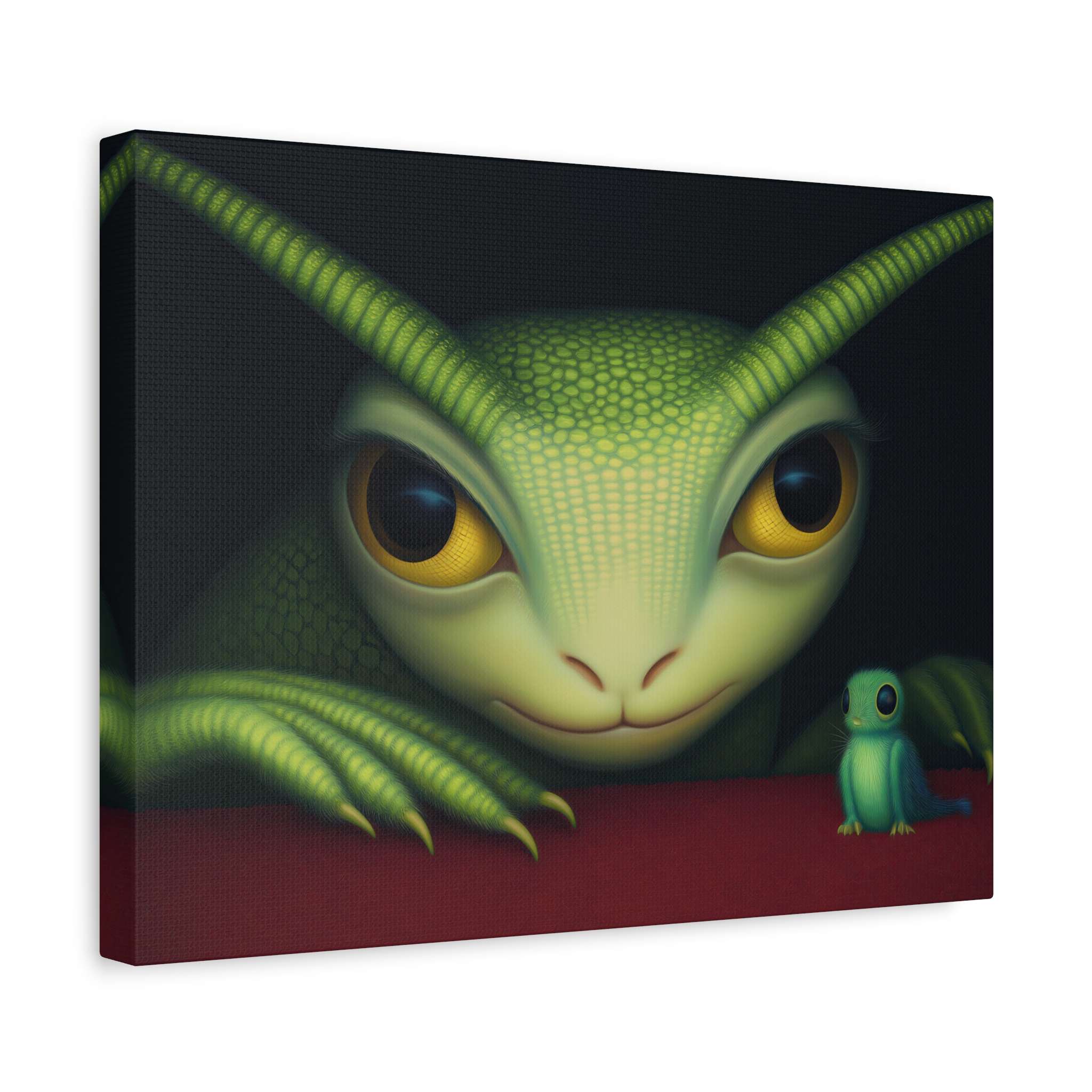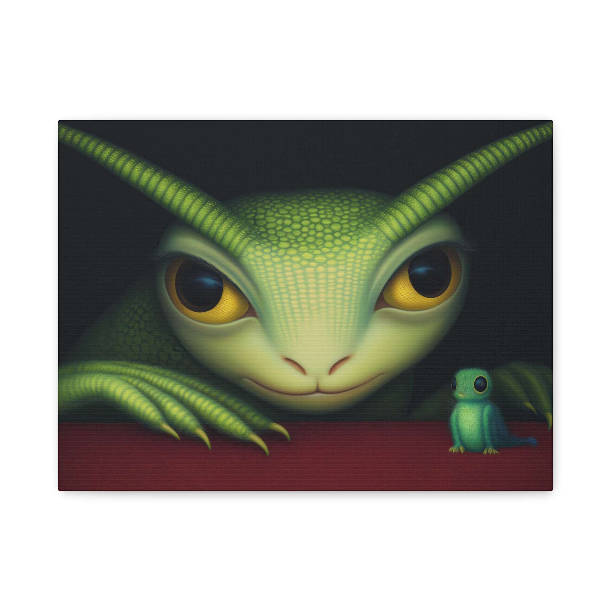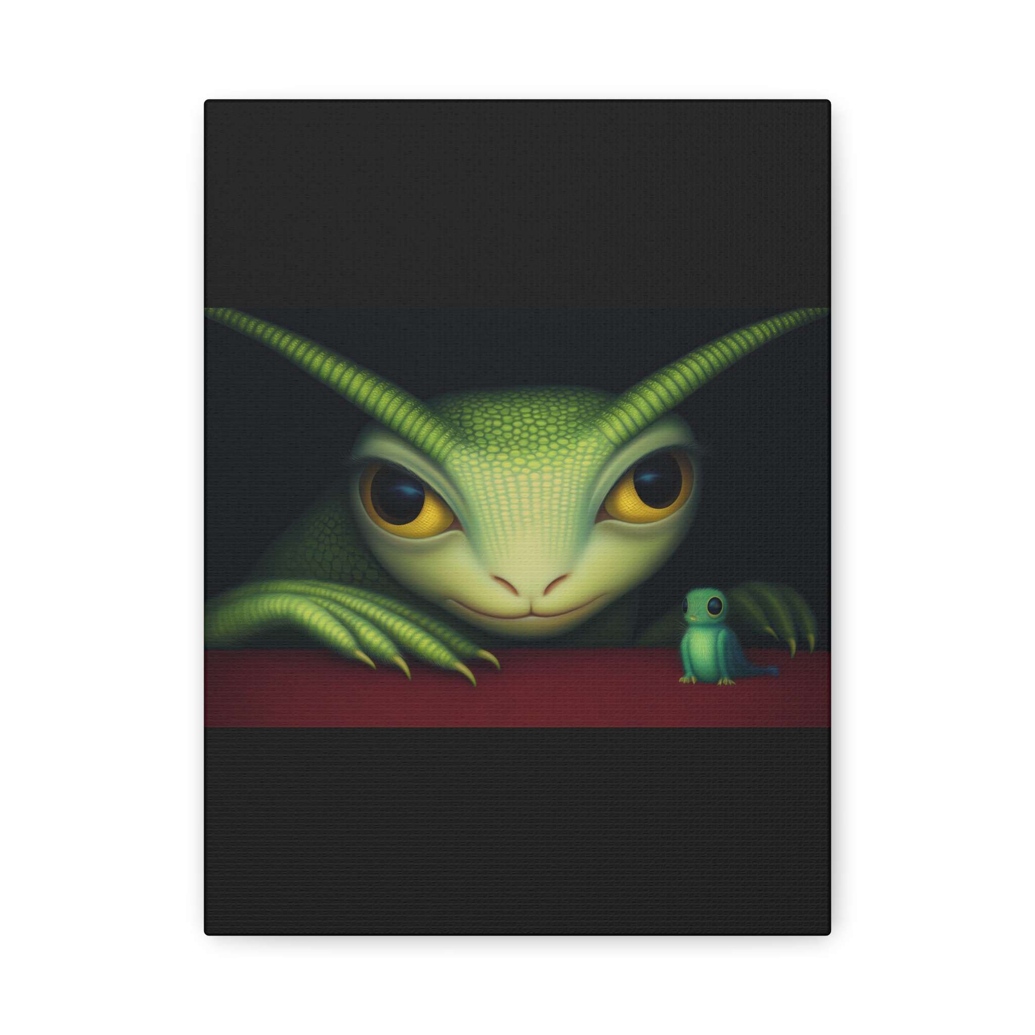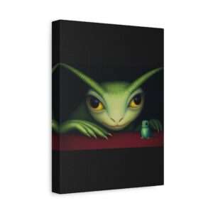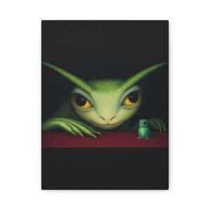 A large green creature with big yellow eyes and textured skin is gazing intently at a smaller, similar creature. Both are positioned against a dark background with the smaller one sitting on a vibrant red surface. Product features – Rubber dots on the bottom ensure canvas stays in place – Printed with highest quality images…