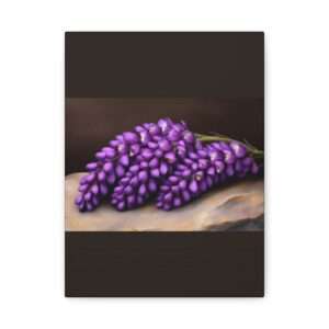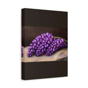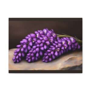 Purple lupine flowers are arranged gracefully on a smooth stone surface, set against a dark, rich background. The vibrant colors and delicate petals create a striking contrast.