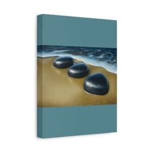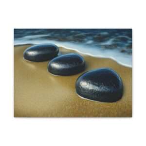 Smooth, dark stones are nestled in the sand near the ocean’s edge, with gentle waves approaching. The scene conveys a sense of tranquility and natural beauty, enhanced by the soft lighting and serene atmosphere. 1