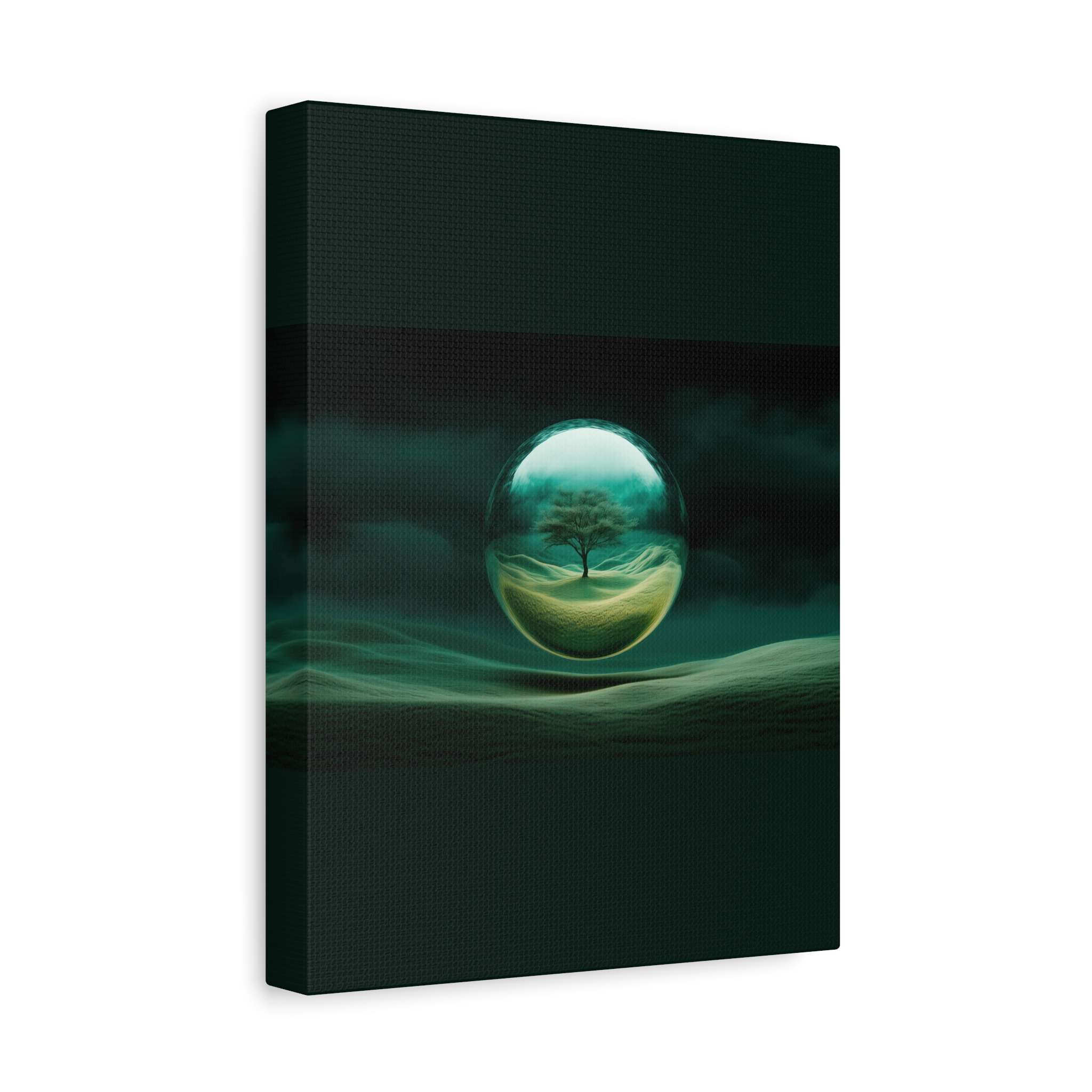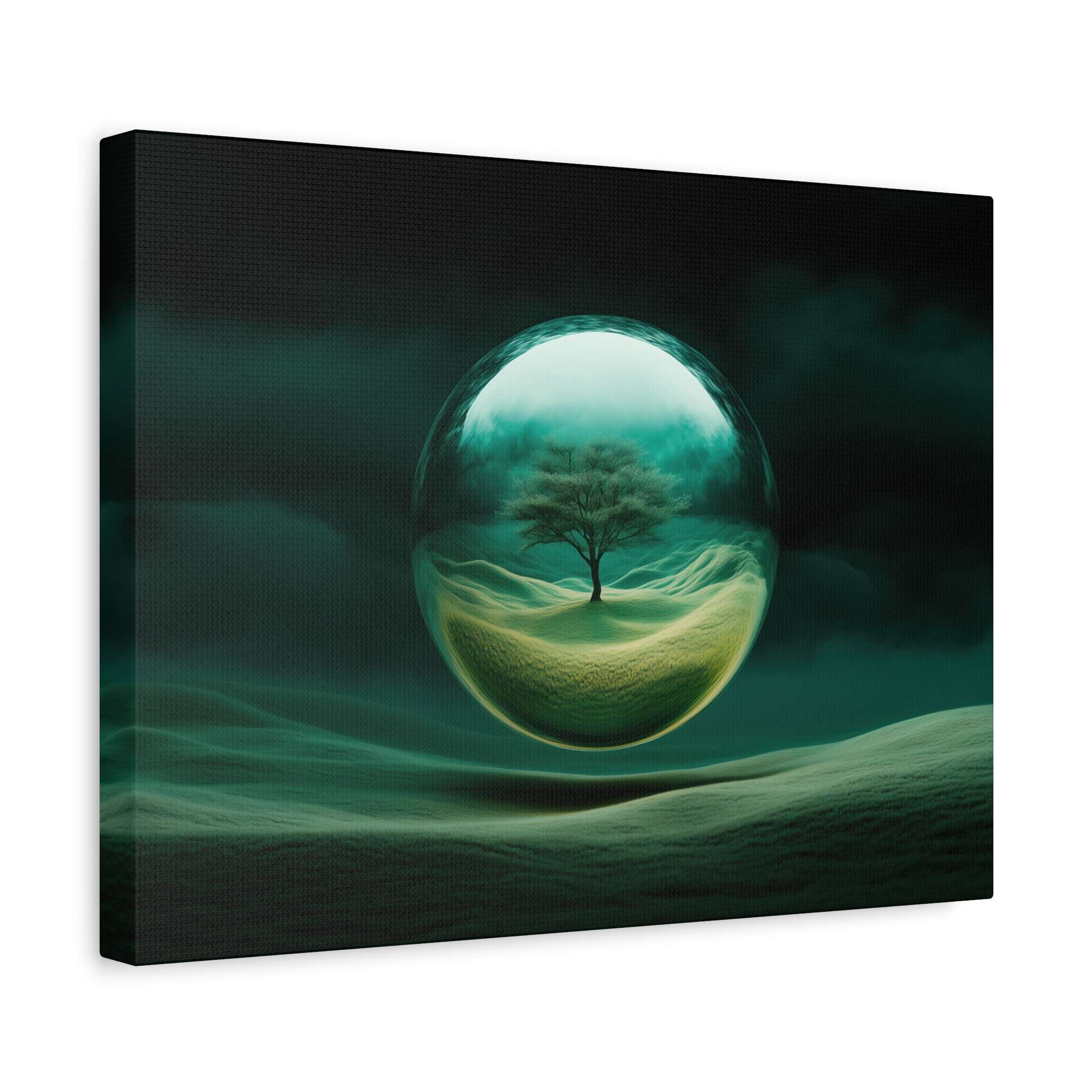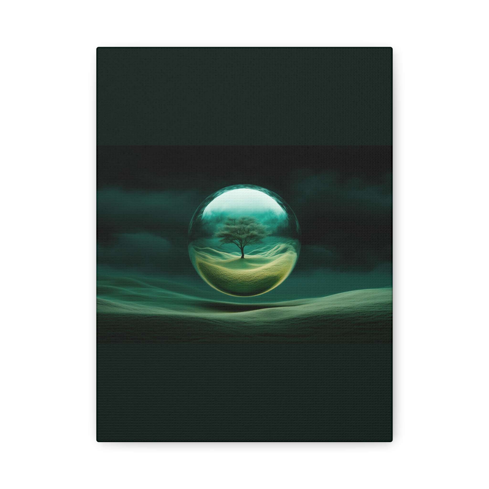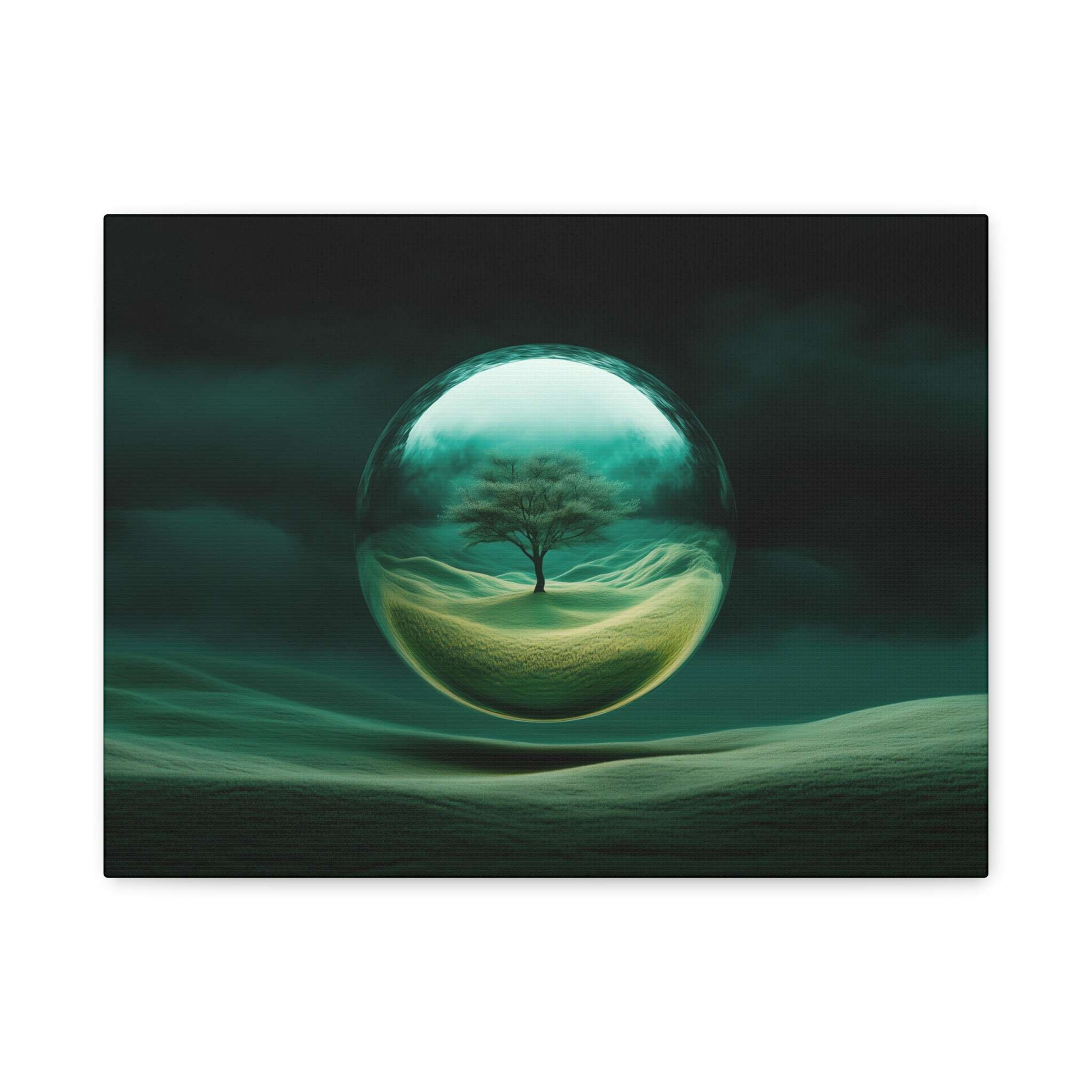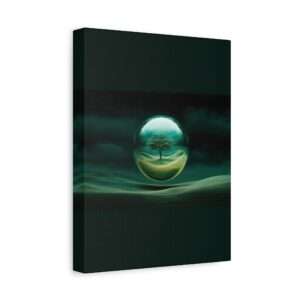 This canvas print features a lone tree within a transparent sphere against a surreal landscape, exuding tranquility and mystery. Perfect for nature lovers and those who appreciate fantastical art. Ideal for home decor, adding a touch of surreal beauty to any room. Relevant for birthdays, housewarmings, and art enthusiasts.