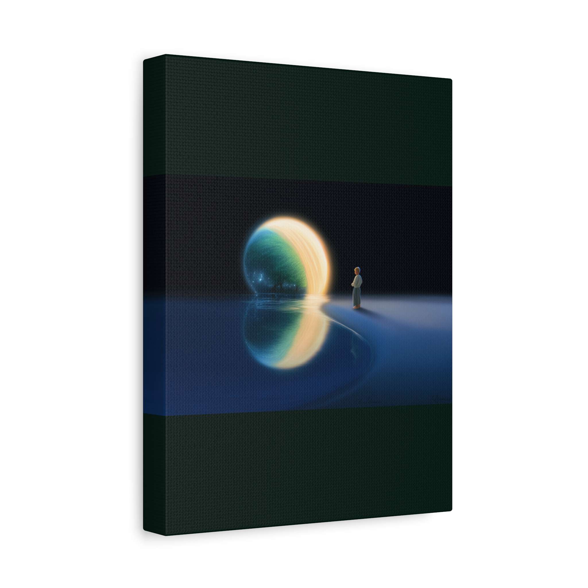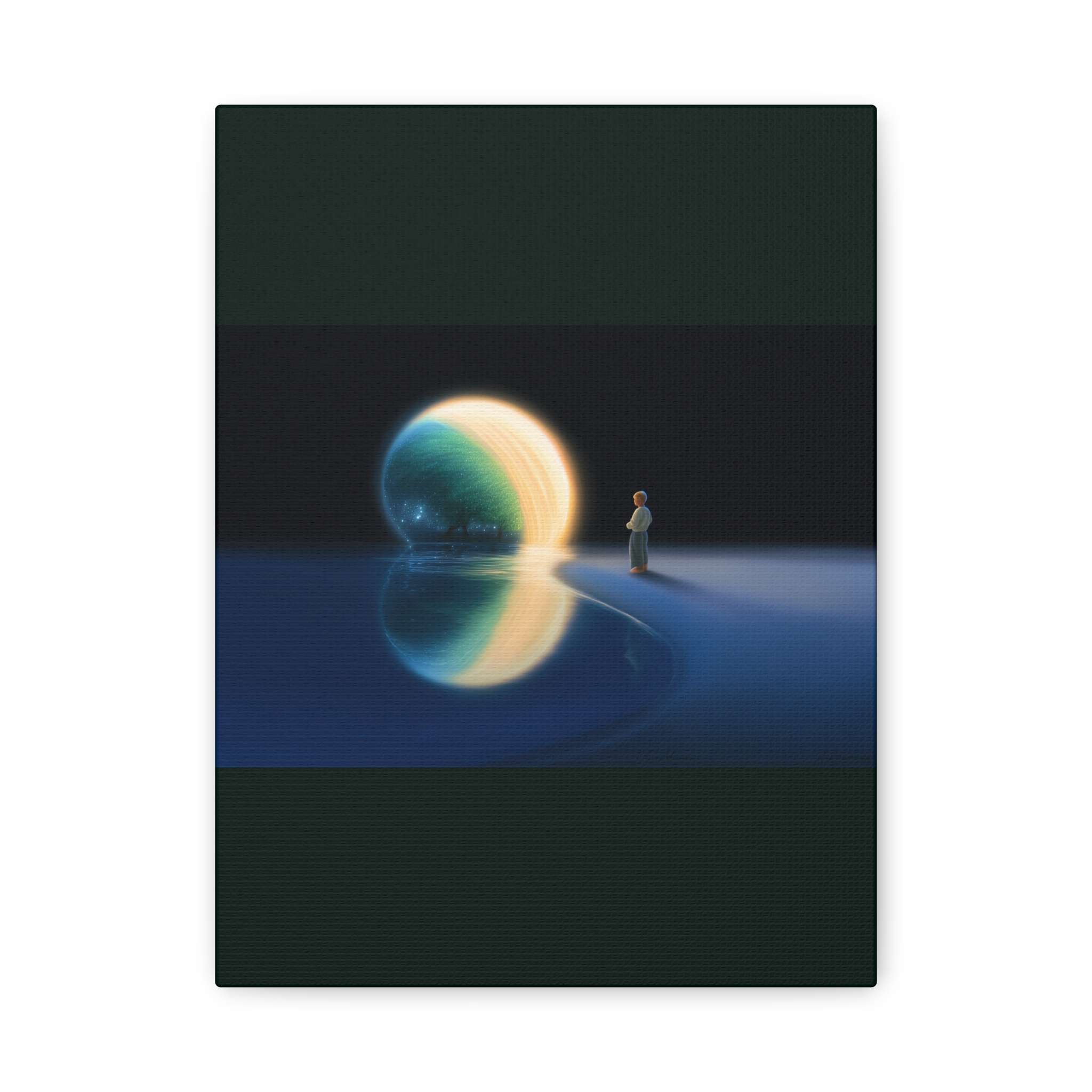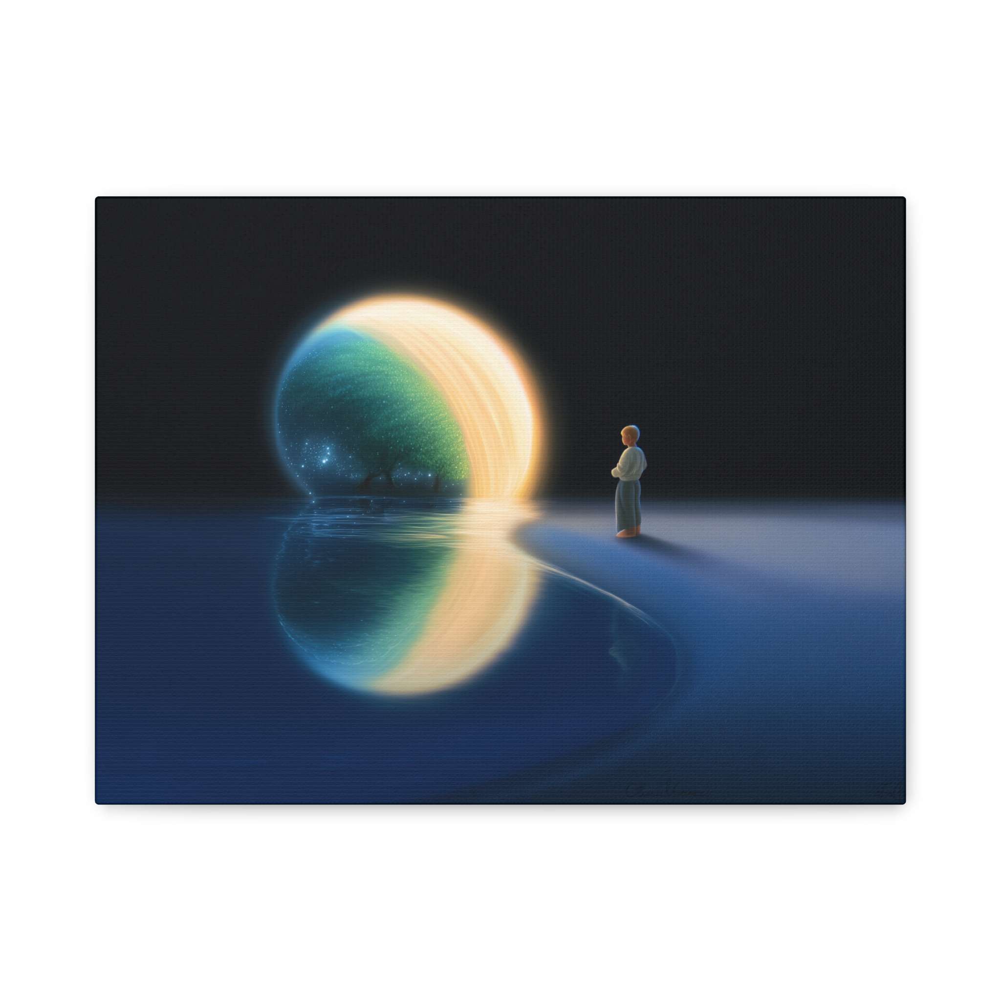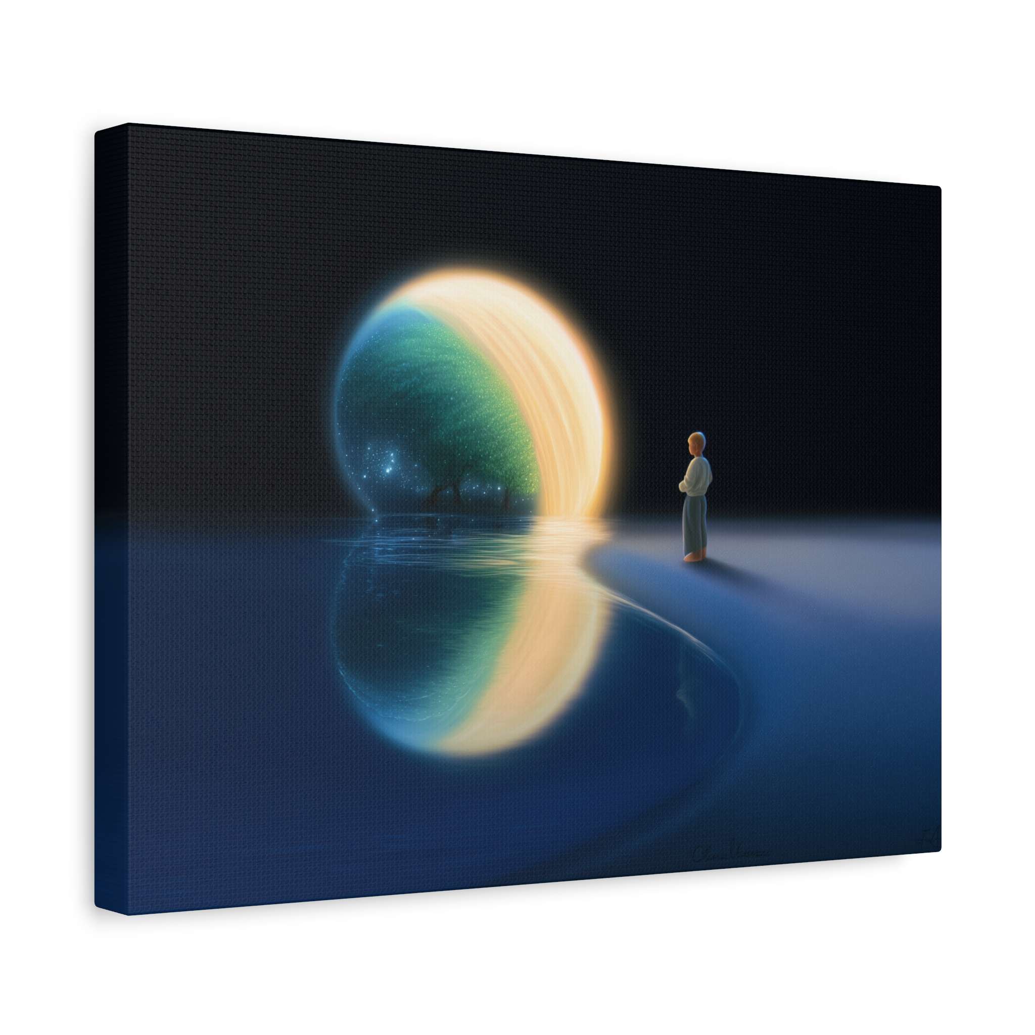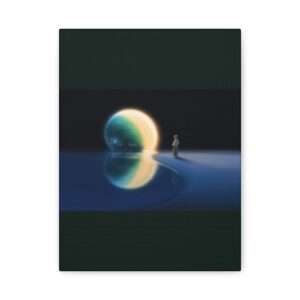Transport yourself to a serene waterfront scene with this canvas print featuring a person gazing at a glowing orb above the water, reflecting a celestial landscape with a tree and shimmering stars. Perfect for adding a peaceful and dreamy atmosphere to your living space, this canvas print is ideal for art enthusiasts, nature lovers, and those who appreciate a touch of fantasy in their decor. Great for gifting on birthdays, holidays, or housewarmings.