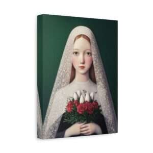 A young girl with long hair is draped in a delicate lace veil, holding a bouquet of red roses and white tulips. She gazes forward with a serene expression against a deep green background.   1